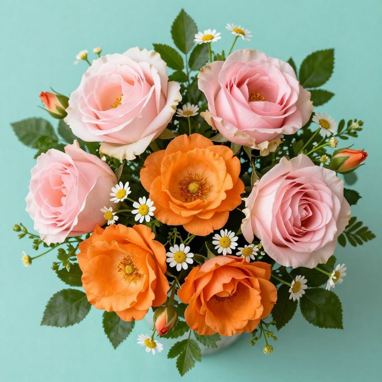 Photograph of a vibrant flower bouquet against a pale turquoise background. The bouquet includes five pink roses, three orange roses, and small white daisies with yellow centers. The roses have fully bloomed petals with soft, delicate textures, while the daisies are small and round. Green leaves and unopened rose buds are interspersed throughout the arrangement, adding depth and contrast to the colorful blooms. The image is brightly lit, highlighting the natural beauty and freshness of the flowers.