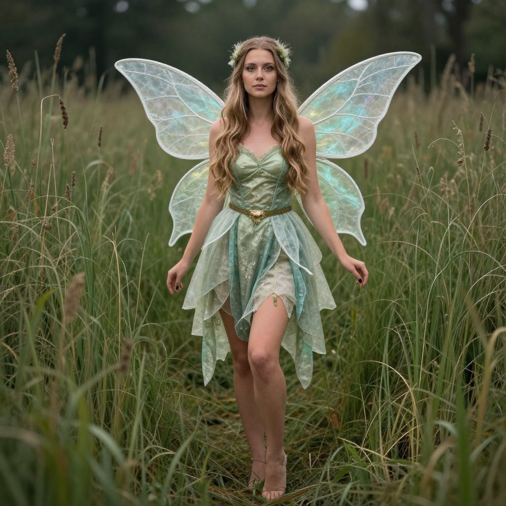 Photograph of a young woman with long, wavy blonde hair wearing a delicate, light green fairy dress with a gold belt and translucent, iridescent wings. She has a floral crown on her head and is walking through a tall, green grass field with a blurred forest background. Her dress has a shimmering, ethereal texture, and her wings are semi-transparent with a faint blue glow. She stands with a confident, slightly mysterious expression. The image is sharply focused on her, with a shallow depth of field that blurs the grass and trees in the background.