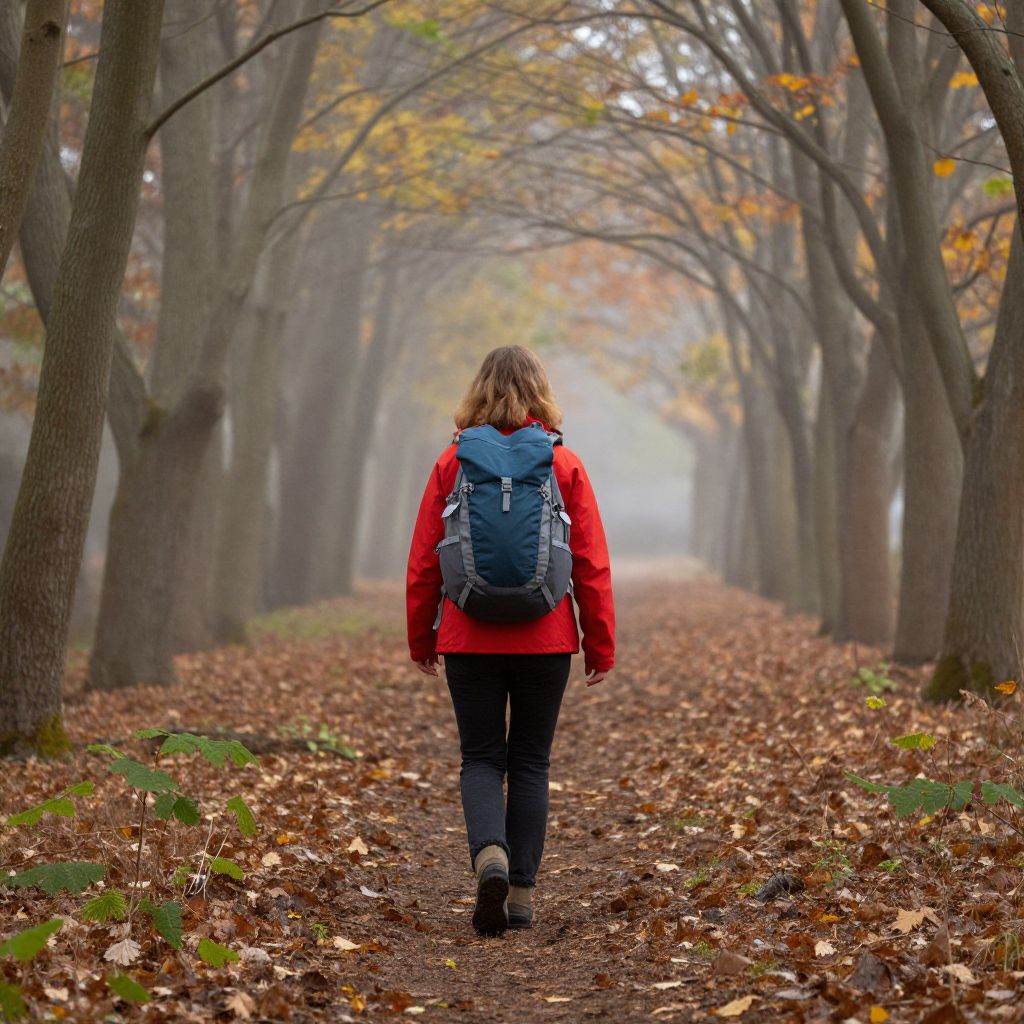 Photograph of a woman standing in a foggy, autumn forest. She has light skin and dark brown hair tied back, wearing a bright red jacket, black pants, and black boots. She carries a large blue backpack with multiple compartments. The forest floor is covered with brown leaves, and tall, leafless trees with yellow and brown foliage surround her. The fog creates a misty, ethereal background, obscuring the forest's depth. The woman looks upwards, with a calm expression, and is centered in the frame. The image captures a serene, contemplative moment in nature.