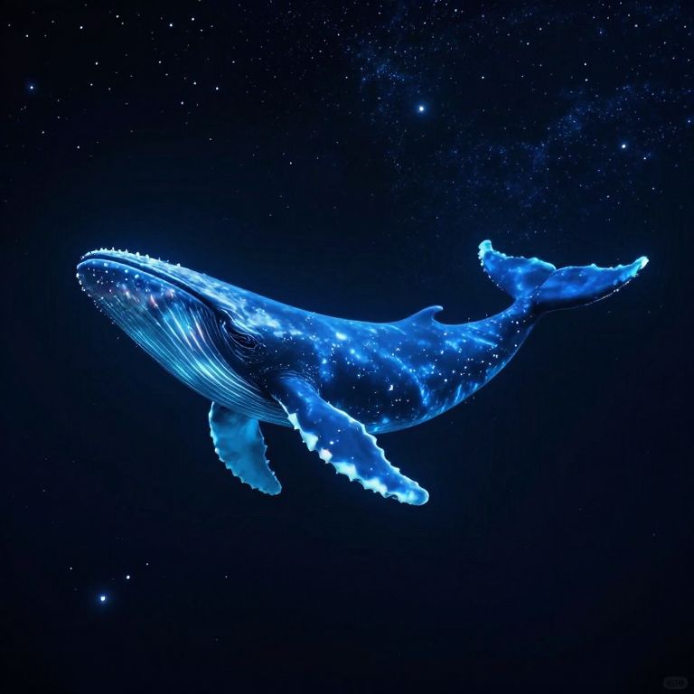 Bioluminescent whispers of serenity drift through the cosmos, as a celestial whale navigates the infinite expanse, its ethereal glow weaving tales of freedom and transcendence amidst the timeless dance of stars.
