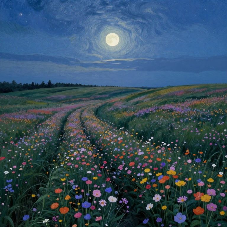Imagine a tranquil night scene under the soft illumination of a full moon, reminiscent of van Gogh's masterful strokes. An aerial view reveals rolling hills adorned with fields of vibrant flowers, their petals rendered in fluid motions as if stirred by an unseen hand. The sky above is a canvas of swirling blues and indigos, dotted with twinkling stars. A gentle evening breeze dances through the blossoms, causing them to sway harmoniously, imbuing the landscape with a sense of serene contemplation—a nocturnal tableau where nature's splendor intertwines with the artist's unique vision.