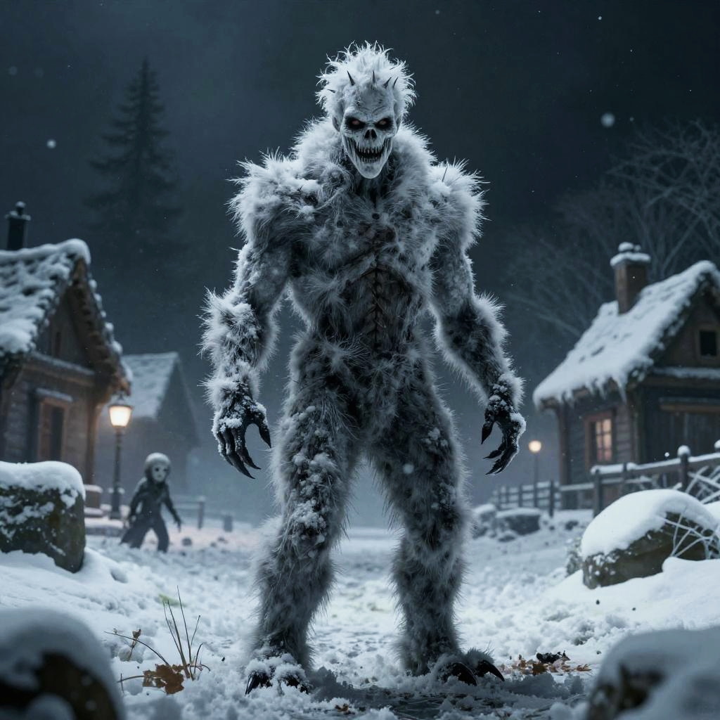 Digital illustration of a terrifying, snow-covered monster standing in a snowy village at night. The creature has a humanoid shape, with white, furry, snow-like texture covering its muscular body. Its face is grotesque with a wide, menacing grin and glowing eyes. It has large, sharp claws on its hands. In the background, two snow-covered houses with lit windows are visible, and a smaller, shadowy figure stands to the left. The night sky is dark with falling snow, adding to the eerie atmosphere. The ground is covered in thick snow, with a stone path leading to the monster.