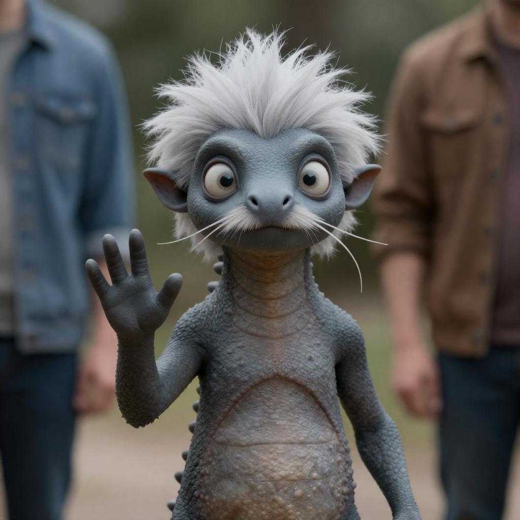 Photograph of a detailed, gray, dragon-like creature with spiky white hair, large expressive eyes, and a long, thin mustache. It waves with its right hand, standing between two blurred human figures in blue and brown clothing. The creature's ured skin and realistic features contrast with the soft-focus background.