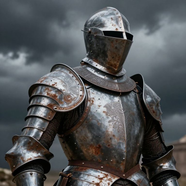 Photograph of a medieval knight in full, weathered steel armor, featuring intricate floral engravings. The knight's helmet has a narrow, opaque visor, obscuring their face. The armor is dented and rust-streaked, reflecting the overcast, stormy sky in the background. The knight's muscular build is partially visible through the armor's articulated plates. The lighting highlights the metallic texture and wear, creating a dramatic contrast with the dark, cloudy sky. The image conveys a sense of historical realism and rugged durability.