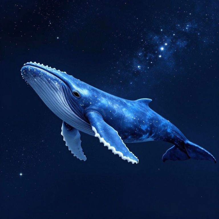 Digital illustration of a glowing blue whale with illuminated edges, swimming through a starry, cosmic ocean background.