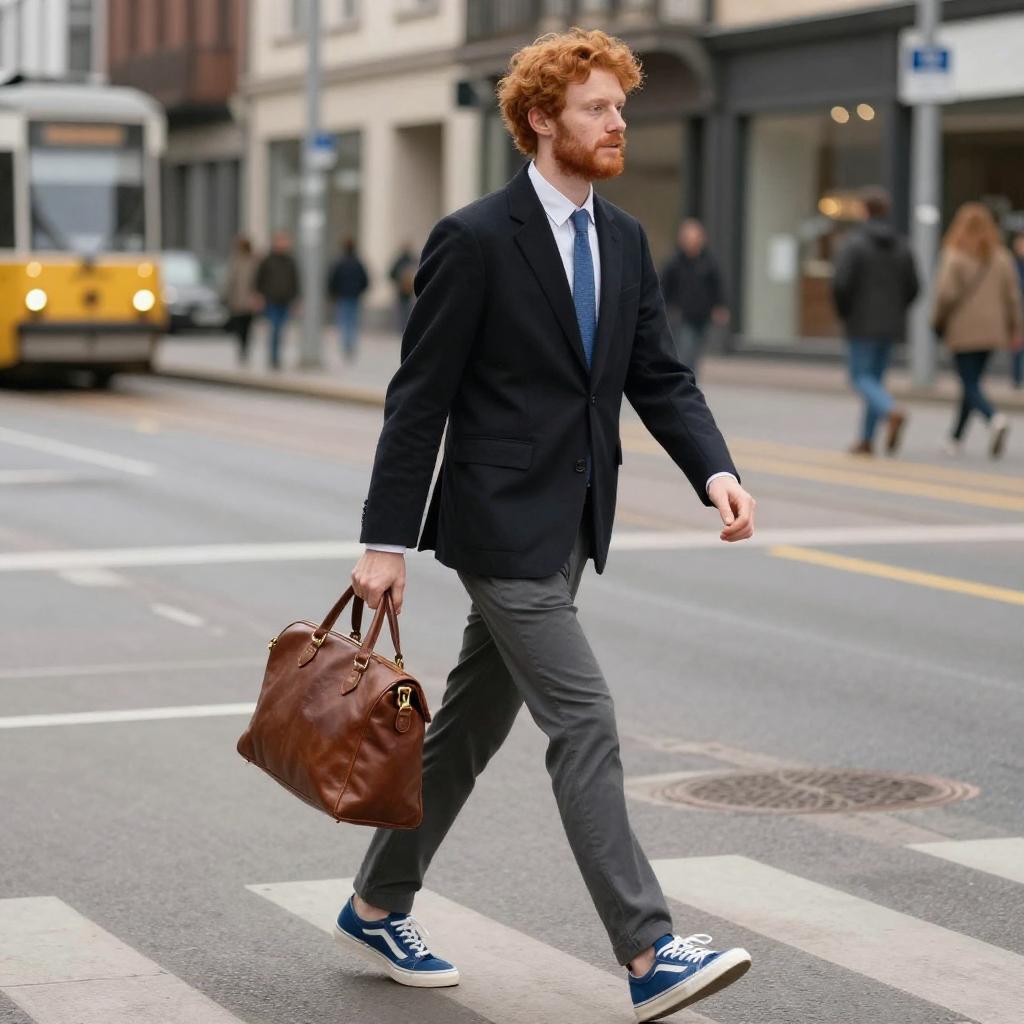 Photograph of a young, red-haired man with a beard, crossing a city street. He's wearing a black blazer, white shirt, blue tie, gray pants, and blue and white sneakers. He's carrying a brown leather bag in his right hand. The camera angle is eye-level, capturing him mid-stride. The background is slightly blurred, with buildings and a yellow tram on the left. Natural daylight, shallow depth of field.