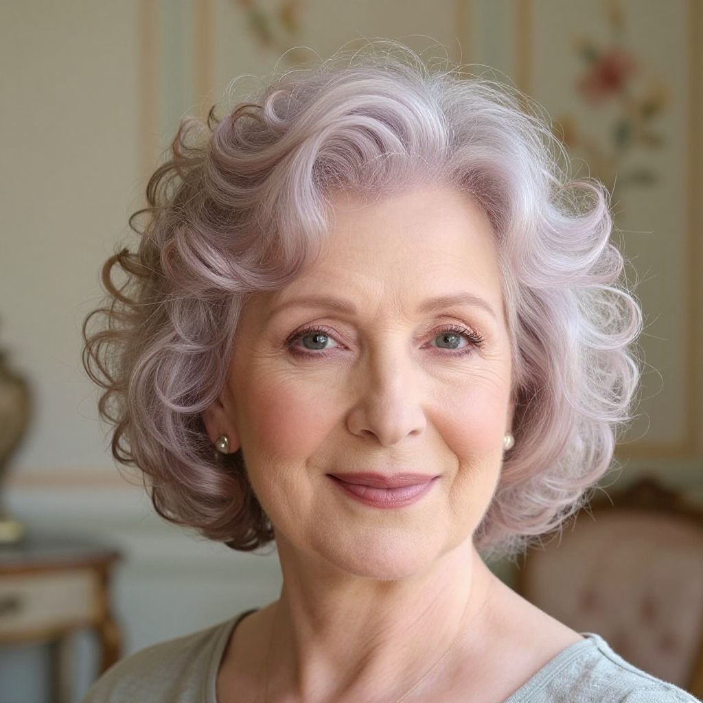 Short curly hair for older women, silver strands mixed with soft pastel hues, elegant and voluminous curls framing a joyful face, soft natural lighting enhancing the texture, background of a cozy vintage room with subtle floral patterns.