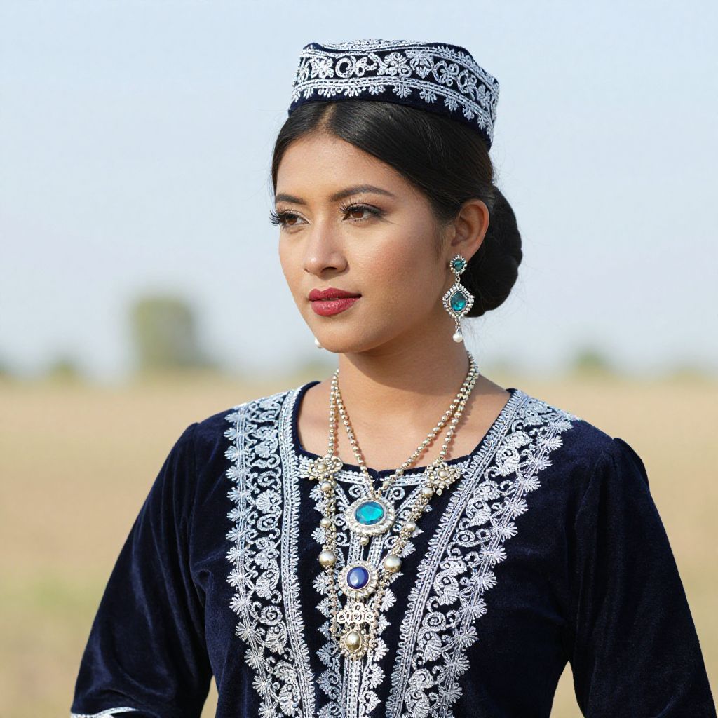 Photograph of a young South Asian woman with medium brown skin and black hair, styled in a neat bun with a white and black embroidered headpiece. She wears a black traditional long-sleeve dress adorned with intricate white floral embroidery and turquoise gemstone accents at the neckline and chest. Her earrings match the headpiece and dress, featuring turquoise stones. She has dark eyebrows, subtle makeup, and a calm expression. The blurred background shows a field under a clear, bright sky. The image has a soft, natural light highlighting her elegant attire and serene demeanor.