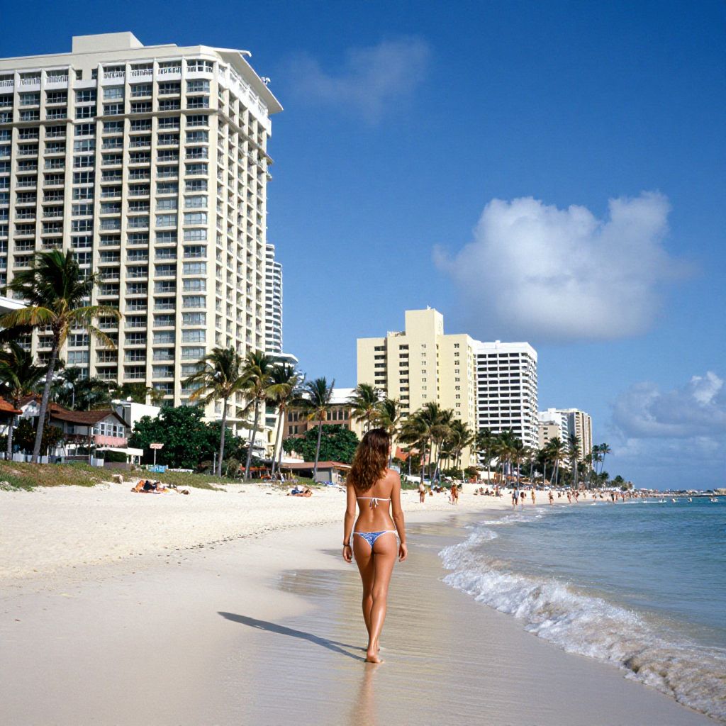 A vibrant high-definition photograph captures a serene beach scene with a woman in a bikini walking along the shoreline, framed by towering hotels and lush palm trees under a bright blue sky with scattered clouds, reminiscent of Wayne Lawrence's archival pigment prints known for their vivid detail and limited edition appeal.