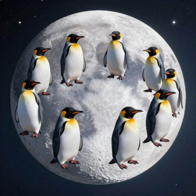 A surreal digital artwork depicts a whimsical flock of penguins orbiting the moon in a synchronized formation, rendered in a cartoonish style with vibrant colors and smooth textures, evoking a blend of fantasy and cosmic wonder.