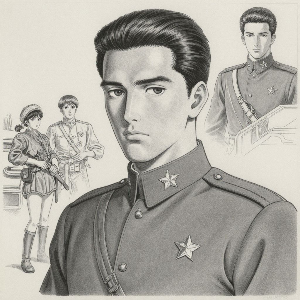 A detailed grayscale drawing of a young man in a military uniform with star emblems on the collar and chest. The artwork showcases a style influenced by Katsuhiro Otomo, J.C. Leyendecker, and Katsuya Terada, combining realistic shading and intricate line work. The main subject has slicked-back hair and a serious expression. In the background, there are secondary sketches of the same man in different poses and an armed woman in a period-style uniform.