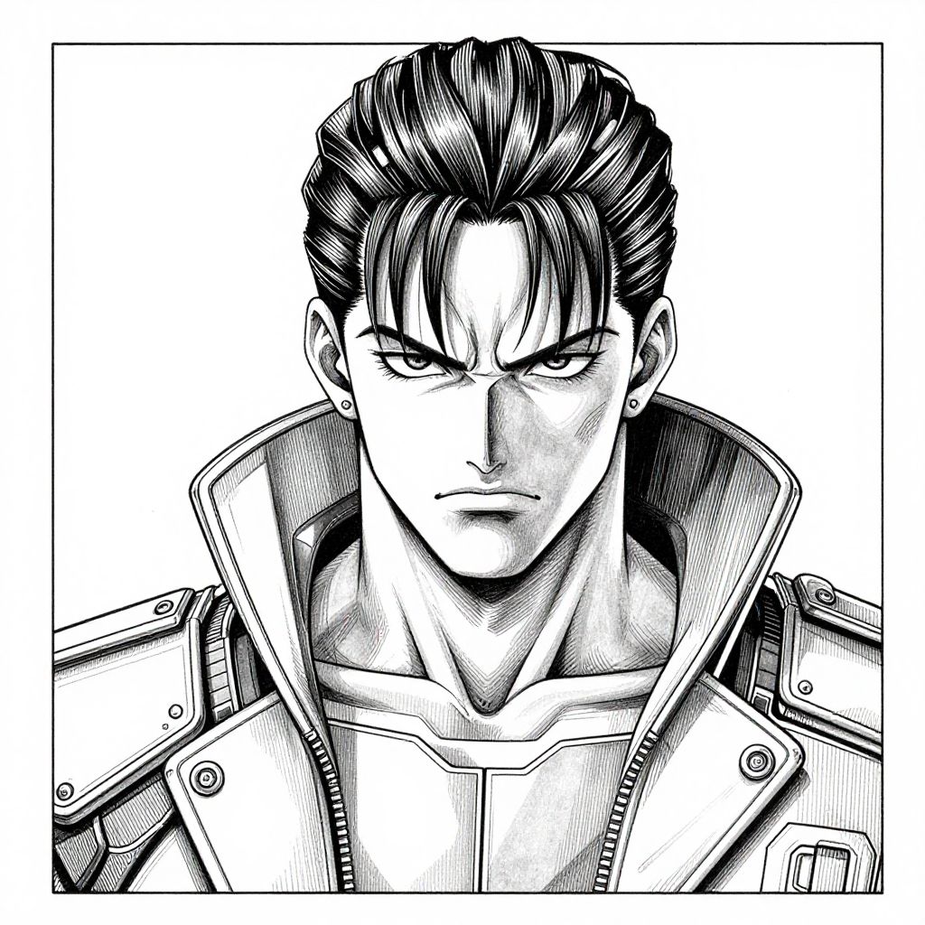 A detailed grayscale drawing of a man in a military uniform with a star emblem, styled in the artistic influences of Katsuhiro Otomo, J.C. Leyendecker, and Katsuya Terada.