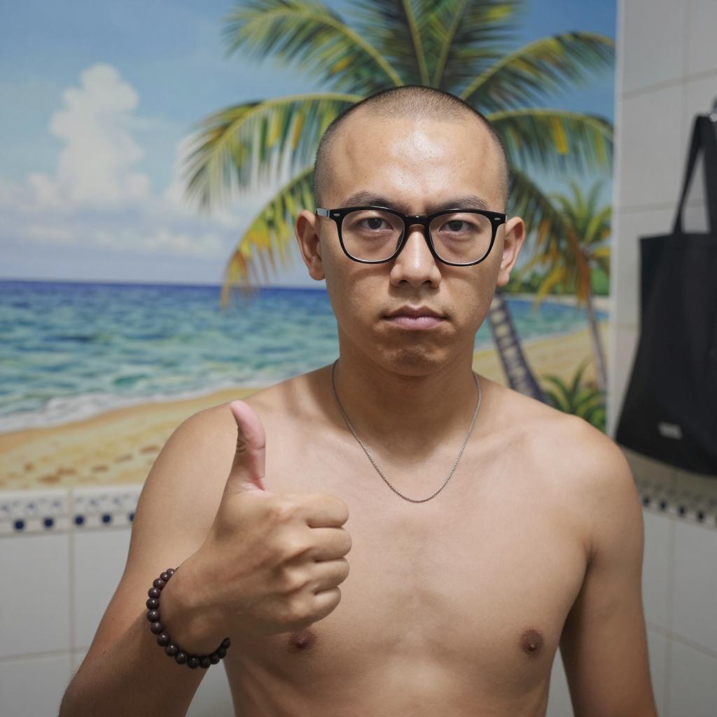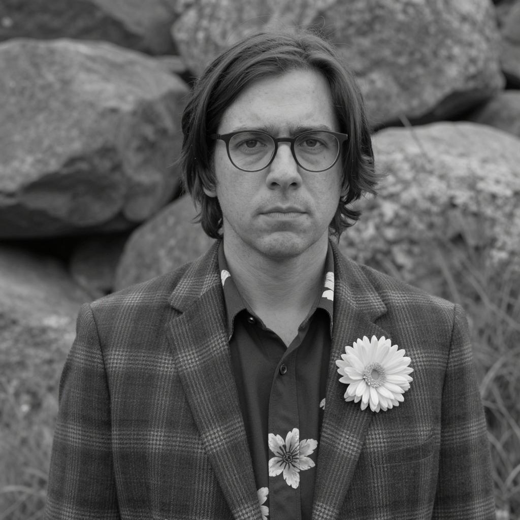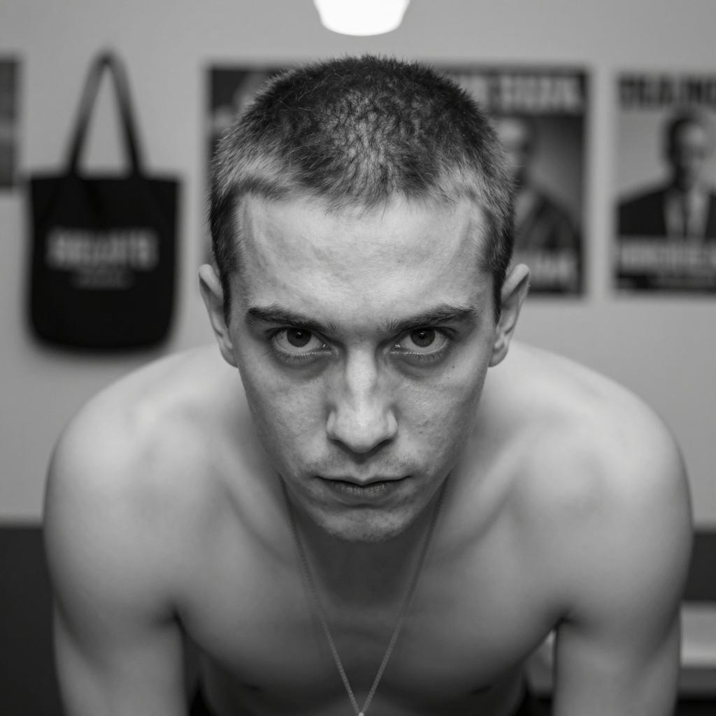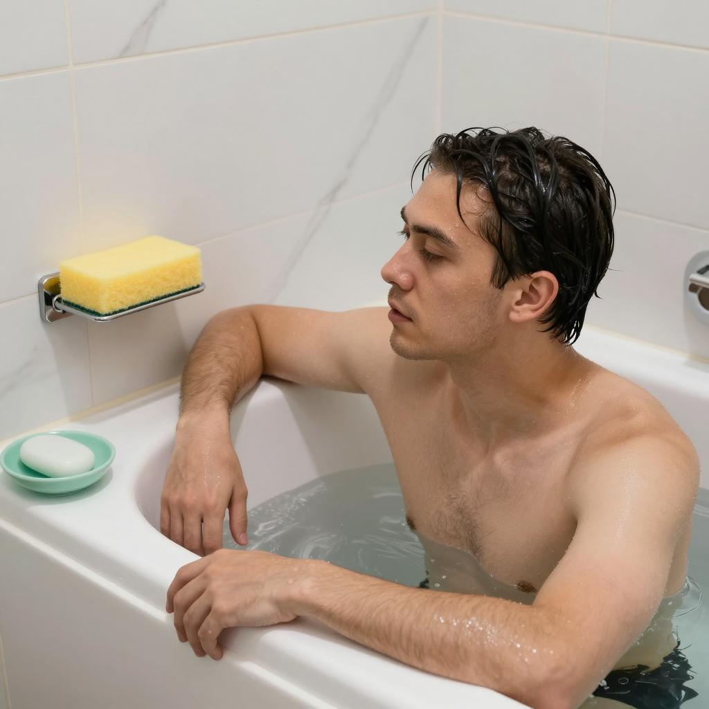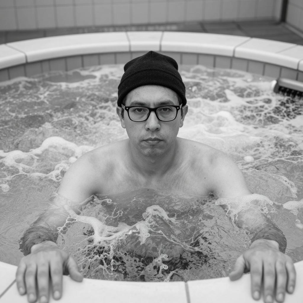 Black and white photograph of a man with glasses and a black hat, chest-up, submerged in a bubbling hot tub. His hands are resting on the tub's edge. The background shows cracked tiles. His facial expression is neutral. The hot tub is circular with a brick rim. The man is centrally positioned in the frame.
