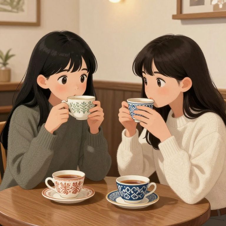 Cute girls with black hair in a cozy café scene, sipping tea and chatting, warm interior with wooden furniture and soft lighting, intricate patterns on cups and clothes, relaxed and intimate mood, realistic illustration with delicate shading and highlights.