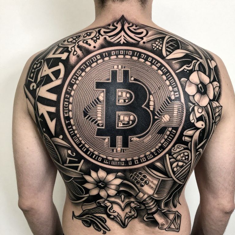 A detailed tattoo on a person's back features intricate designs and the Bitcoin logo at the center.