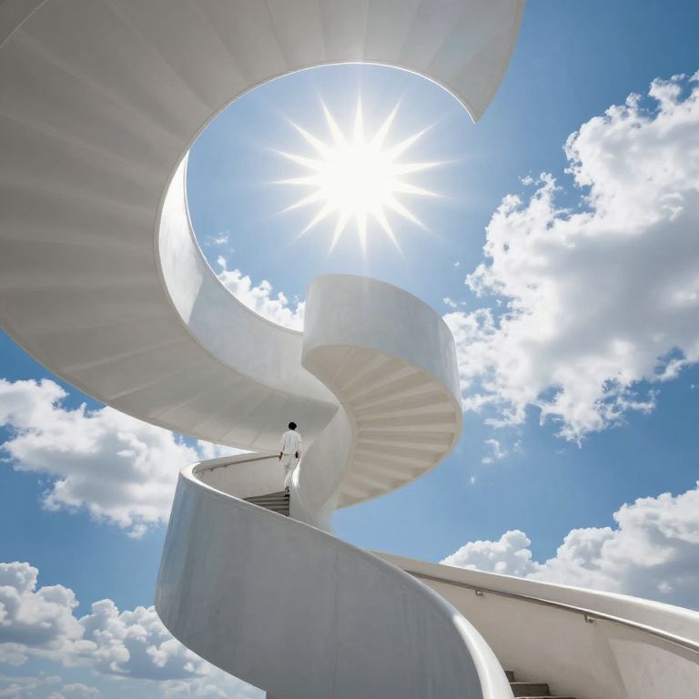 Spiraling staircase ascends gracefully toward a radiant sunburst, its steps narrowing as they curve into the heavens, while a solitary figure in white climbs upward, framed by billowing clouds against a vivid azure sky.