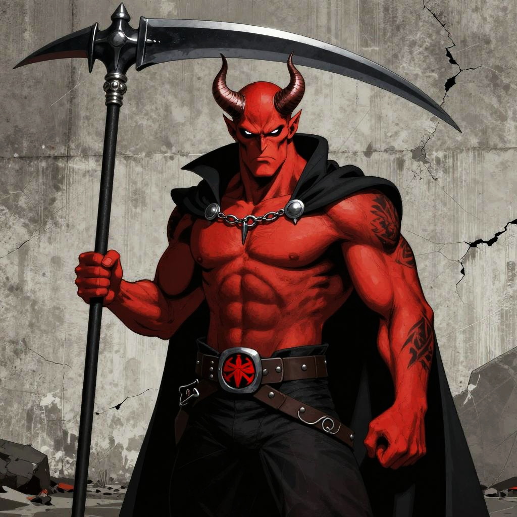 A muscular, red-skinned demon with horns and a stern expression holds a massive, black scythe. He's shirtless, showcasing a chiseled chest and abs, and wears dark pants with a belt that has a red emblem. His right arm is tattooed, and he has a black cape draped over his shoulders. The background is a cracked, gray concrete wall, adding a gritty feel to the scene. The art style is bold and comic-like.