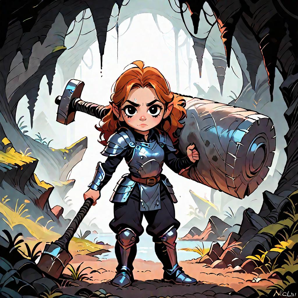 Score_9, score_8_up, score_7_up, score_6_up, score_5_up, score_4_up, high quality, highres, source_anime, 1girl, a female dwarf holding a giant hammer inside a cave, long hair, black eyes, shortstack, heavy armor, dirty, looking at viewer, standing in a cave, dark, cavern background