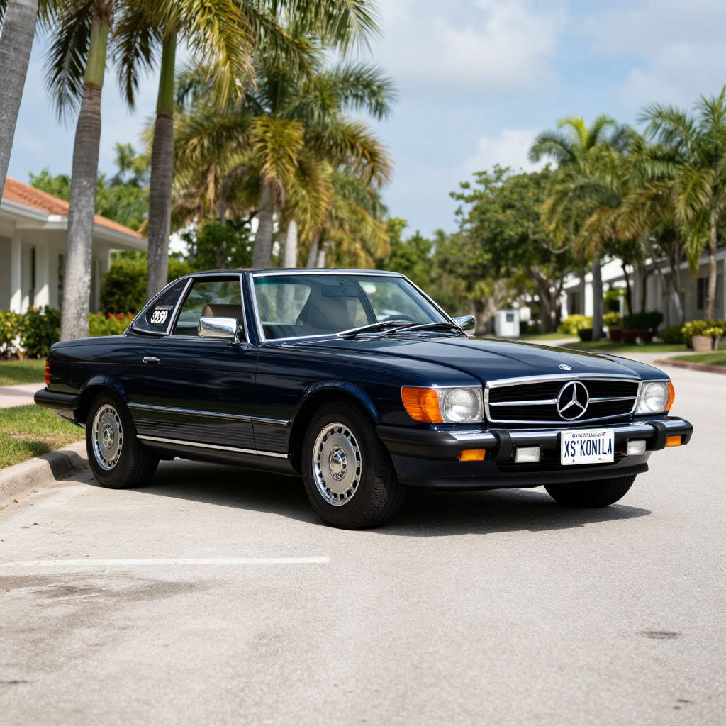 Parked gracefully along a palm-lined street in Marco Island, FL, a classic 1985 Mercedes-Benz 380SL showcases its sleek navy-blue exterior, featuring prominent \"33,99\" badging and a custom license plate reading \"XS'KONILA,\" exuding timeless elegance against a backdrop of lush greenery and a clear sky.