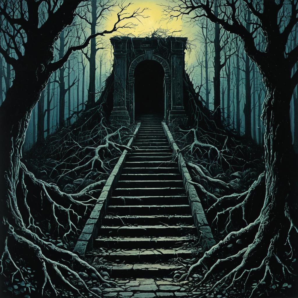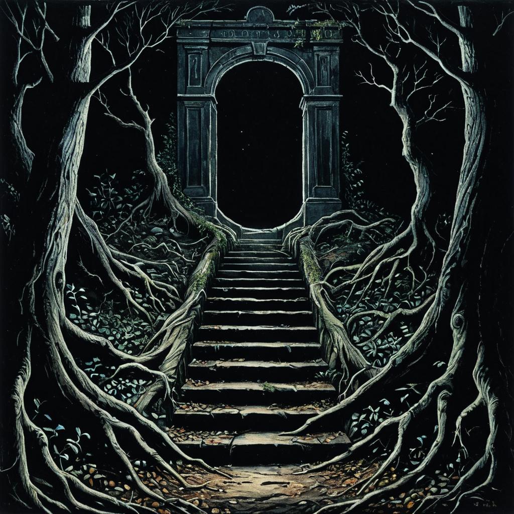 Staircase Overgrown by Tree Roots with Ominous Portal