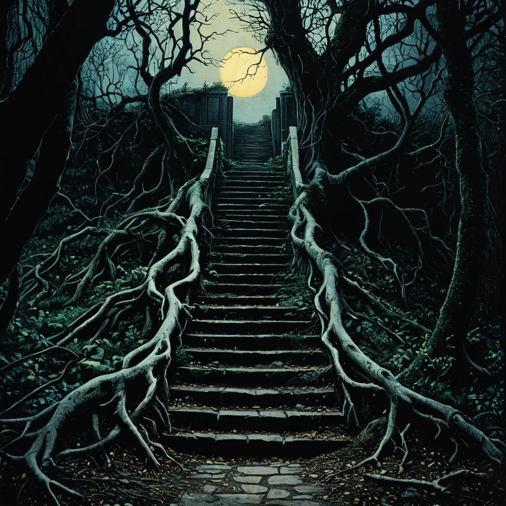 A detailed painting of a stone staircase heavily overgrown by large, twisted tree roots, leading upward to a closed gateway under a glowing full moon. The scene is set at dawn with a dark, eerie atmosphere, featuring dense, shadowy forest surroundings. The image is inspired by Leonardo da Vinci, emphasizing intricate natural forms and mysterious ambiance.