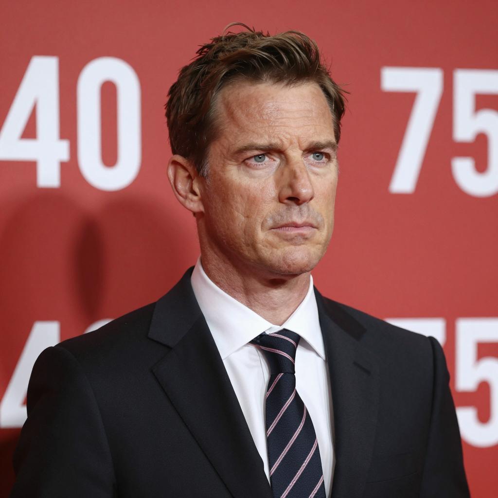 A man with short brown hair and a blue shirt shouting intensely in a crowded stadium. He is clutching his chest with both hands, surrounded by other men who are also expressing strong emotions. The background is filled with blurred spectators and bright stadium lights illuminating the scene.