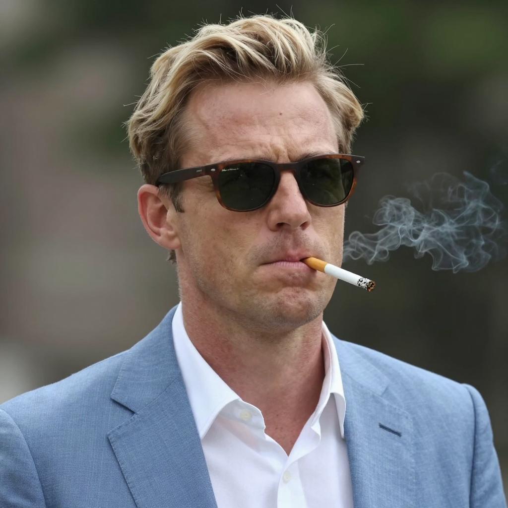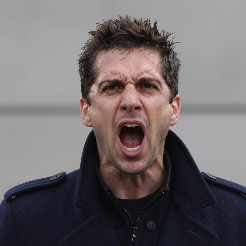 Photograph of a crowded stadium. Central figure, a man with short brown hair, intense expression, mouth open in a shout, wearing a blue shirt, surrounded by people grabbing his arms. Background shows blurred crowd, some making similar expressions. Multiple men in background, varying facial expressions, casual clothing. Bright stadium lights.