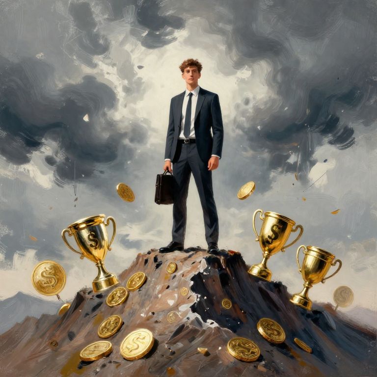 Overconfidence visualized as a young entrepreneur standing confidently atop a mountain of success symbols like gold coins and trophies, storm clouds brewing in the distance, painterly style with expressive brushwork, contrast between triumph and looming challenges.