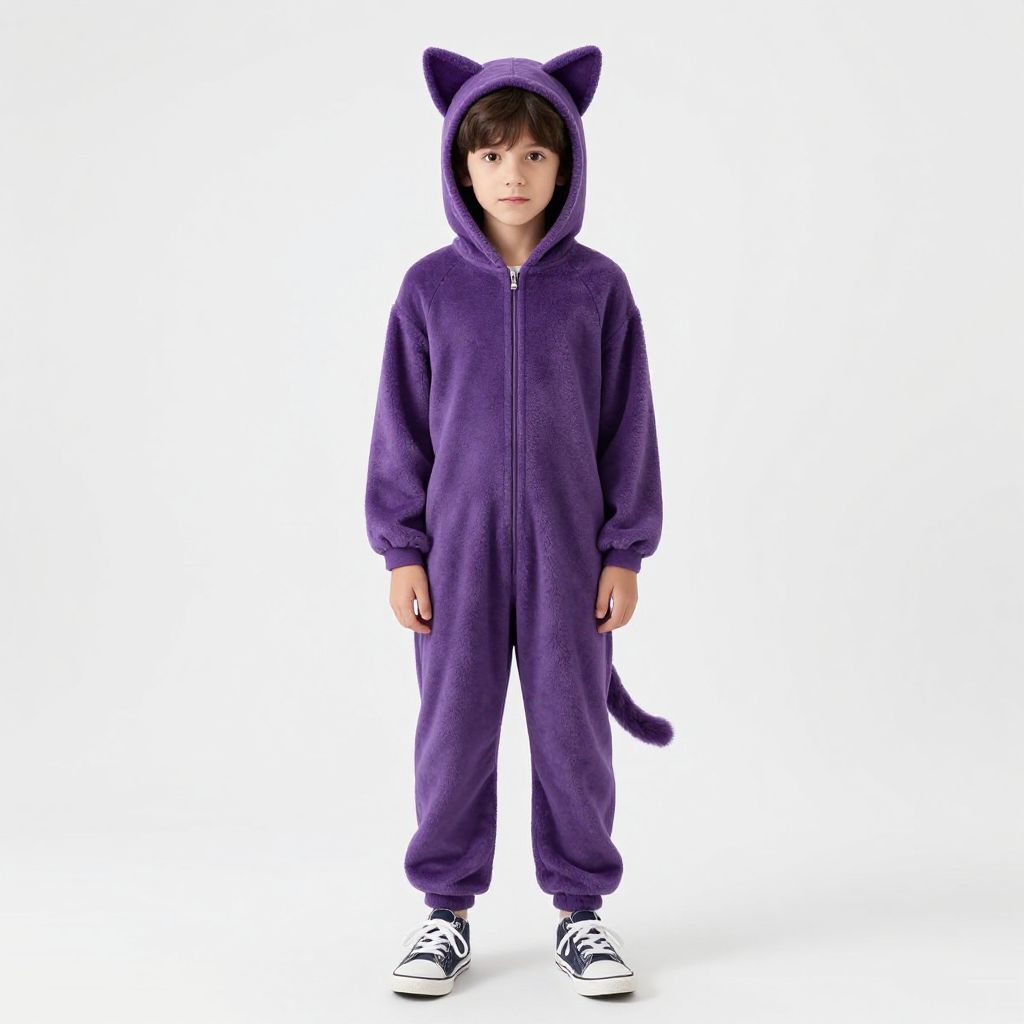 Purple kitty costume, solo, animal costume, cat costume, full body, tail, shoes, 1boy, standing, male focus, brown hair, 1girl, cat tail, kigurumi, white background, simple background, sneakers