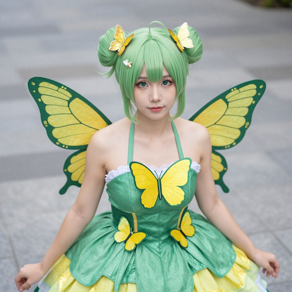 Photograph of a young Asian woman cosplaying a fairy with green hair styled in two buns, adorned with yellow butterfly hairpieces. She wears a green, strapless, glittery dress with yellow butterfly accents on the bodice and skirt. Her wings are large, green with yellow patterns, and she has a small butterfly on her chest. She sits on a grey stone-paved surface, with a soft smile and light makeup. Her fair skin contrasts with her vibrant costume. The background is slightly blurred, focusing attention on her detailed cosplay attire.