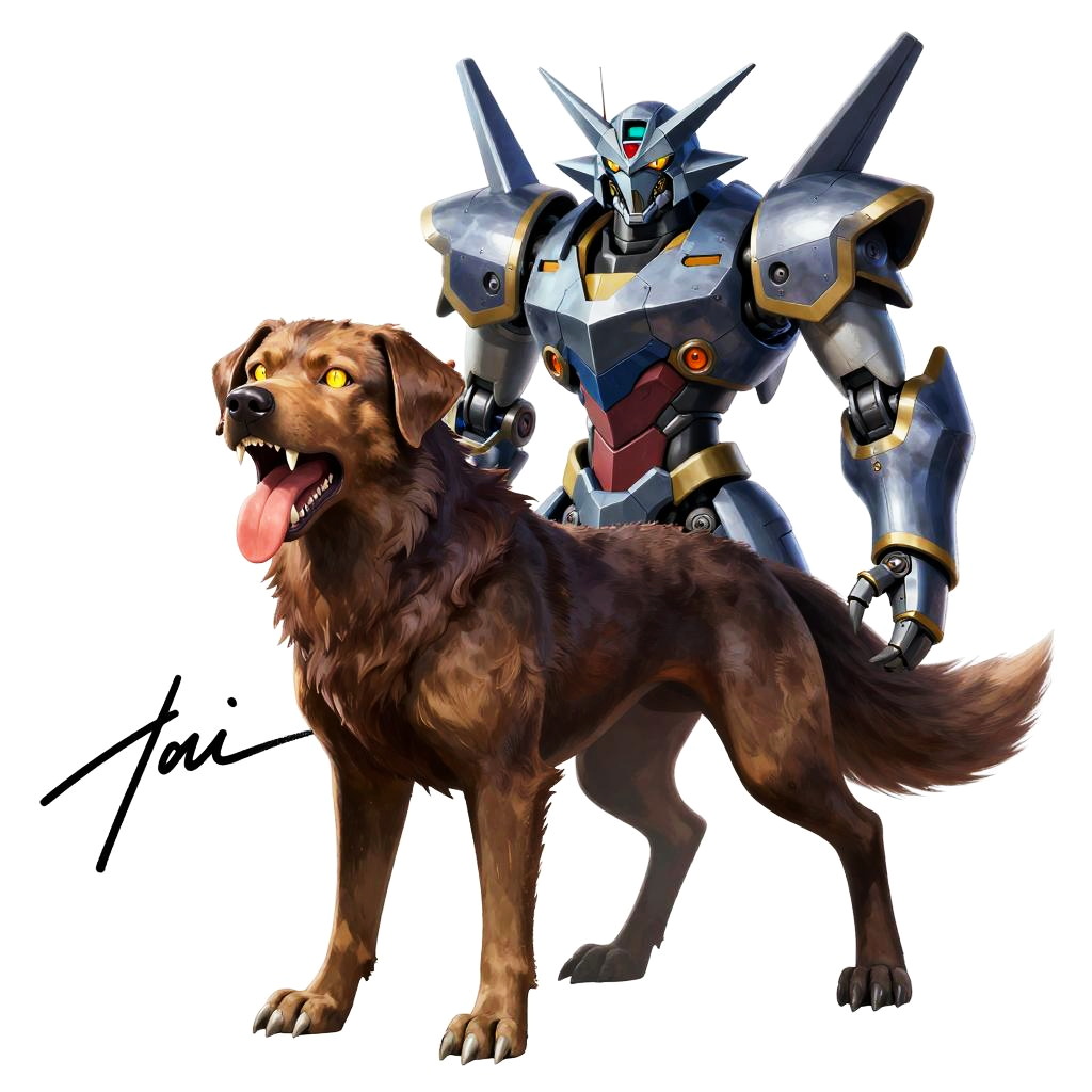 Digital illustration of a robotic mecha and a brown dog standing side by side against a white background. The mecha has a silver and blue metallic body with red accents, angular design, and glowing blue eyes. Its right arm is resting on the dog's back. The dog has a shaggy brown coat, yellow eyes, and a pink tongue hanging out. The mecha's design is reminiscent of anime styles, with sharp lines and vibrant colors. An artist's signature is visible in the bottom left corner. Both characters are fully detailed and centered in the image.