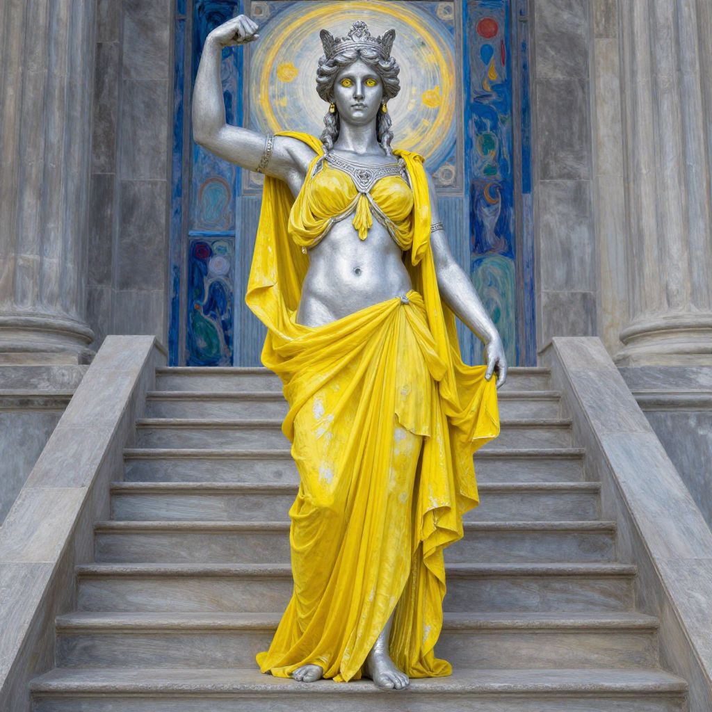 Photorealistic digital artwork of a silver-toned goddess statue with a golden halo, yellow drapery, and ornate armor, standing on grand