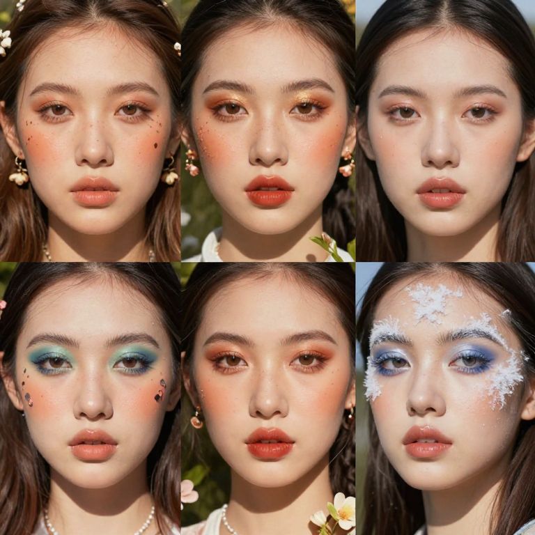 Makeup themes generator illustrating seasonal makeup trends, including autumn-inspired warm hues, spring floral accents, summer vibrant colors, and winter frosty highlights, captured in a natural outdoor environment with soft sunlight.