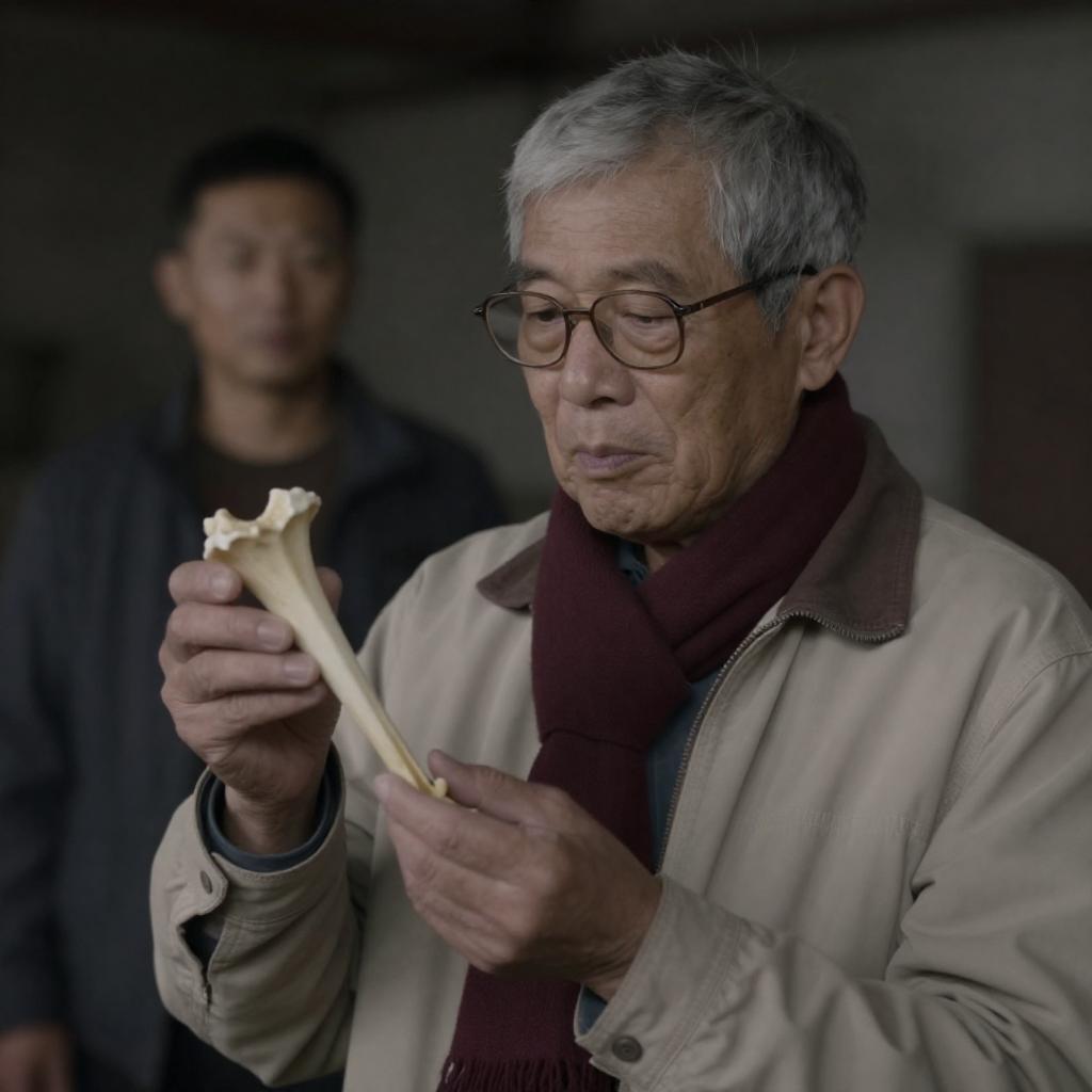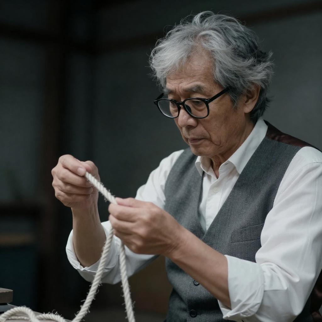 Photograph of an older man with disheveled gray hair and black-rimmed glasses, wearing a white shirt and gray vest, intently examining a tangled white rope. He has a focused expression and is positioned slightly to the right, with a dark, industrial background. The image has a moody, dramatic lighting.