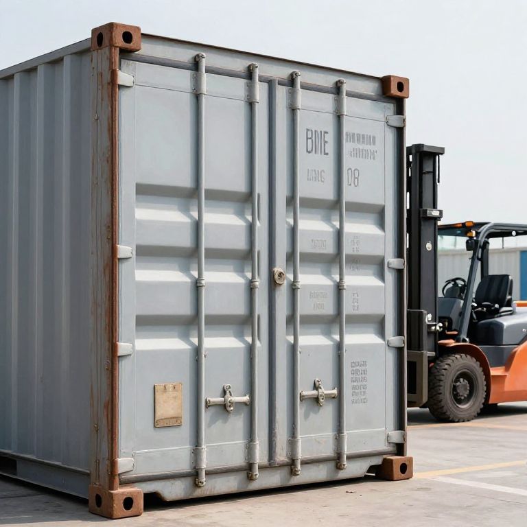 A close-up of a logistics industry shipping container with a detailed view of its metal surface, loading dock equipment, and a forklift in the background, highlighting the industrial aspect of the shipping containers.