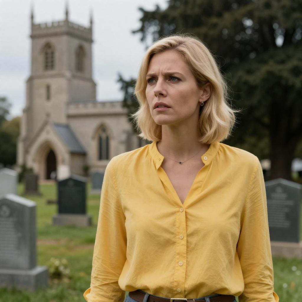 Photograph of two women standing outdoors near a white-framed door. Blonde woman on right with long hair, beige sweater, serious expression. Blonde woman on left with short hair, blue shirt, slightly confused expression. Soft daylight, neutral background. Both women facing forward.