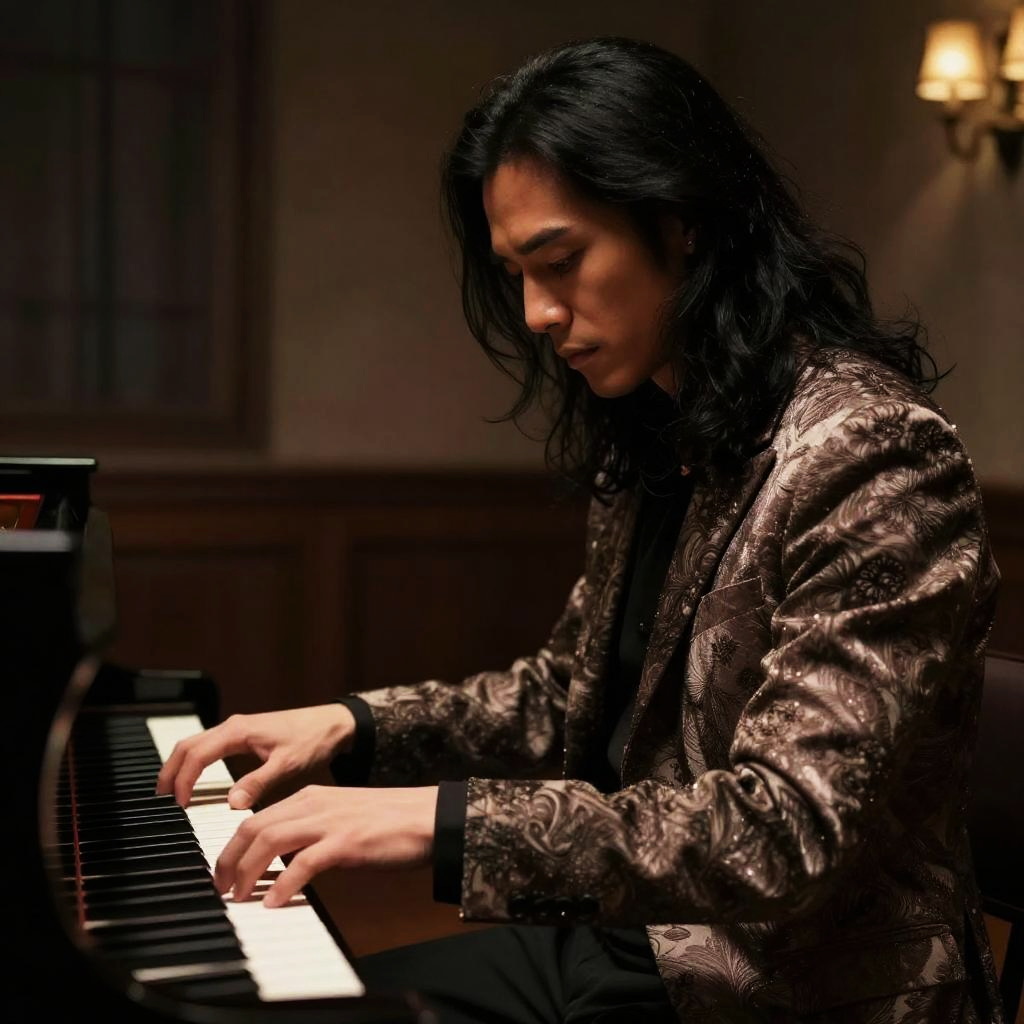 Long black hair male musician playing a grand piano in a dimly lit room, rich textures, elegant clothing, emotional expression, soft shadows and highlights, moody atmosphere, artistic portrait style, highly detailed