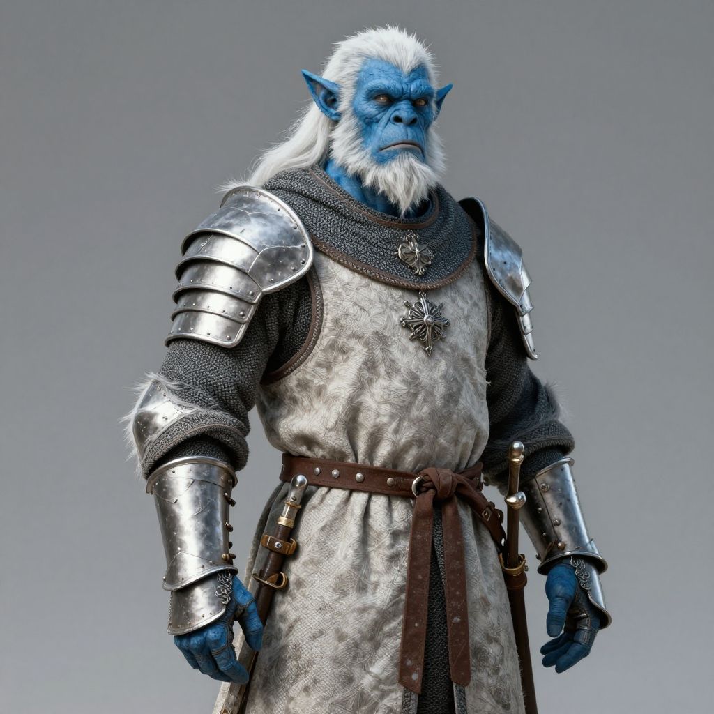 Photorealistic CGI of a blue-skinned, white-haired, bearded orc warrior with pointed ears. He wears silver armor with a chainmail undershirt, a brown leather belt, and a large silver cross pendant. His muscular arms are adorned with shiny, metallic armor plates. The background is a gradient of gray, making the character stand out prominently. The orc's expression is stern, and his intense blue eyes add to his formidable appearance. The texture of his fur, armor, and chainmail are highly detailed, emphasizing realism.