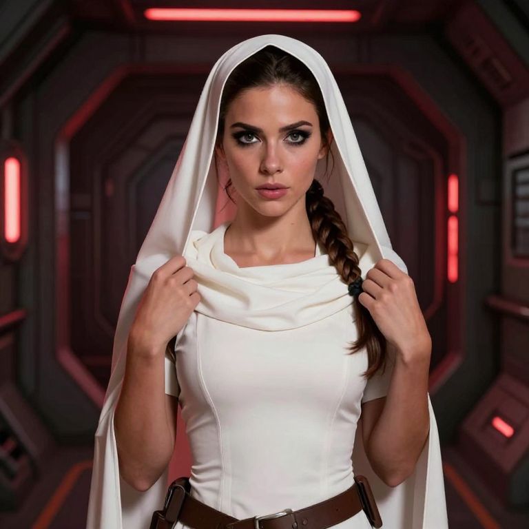 Jober1 illustration of a close of Lara Croft looking hesitantly at the viewer pulling back a white cowl, Lara is dressed in the white dress of Princess Leia, and has her heavy eyeliner, her braid is visible pulled forward, The composition is dark, with red lighting from a single source inside a futuristic industrial space ship corridor