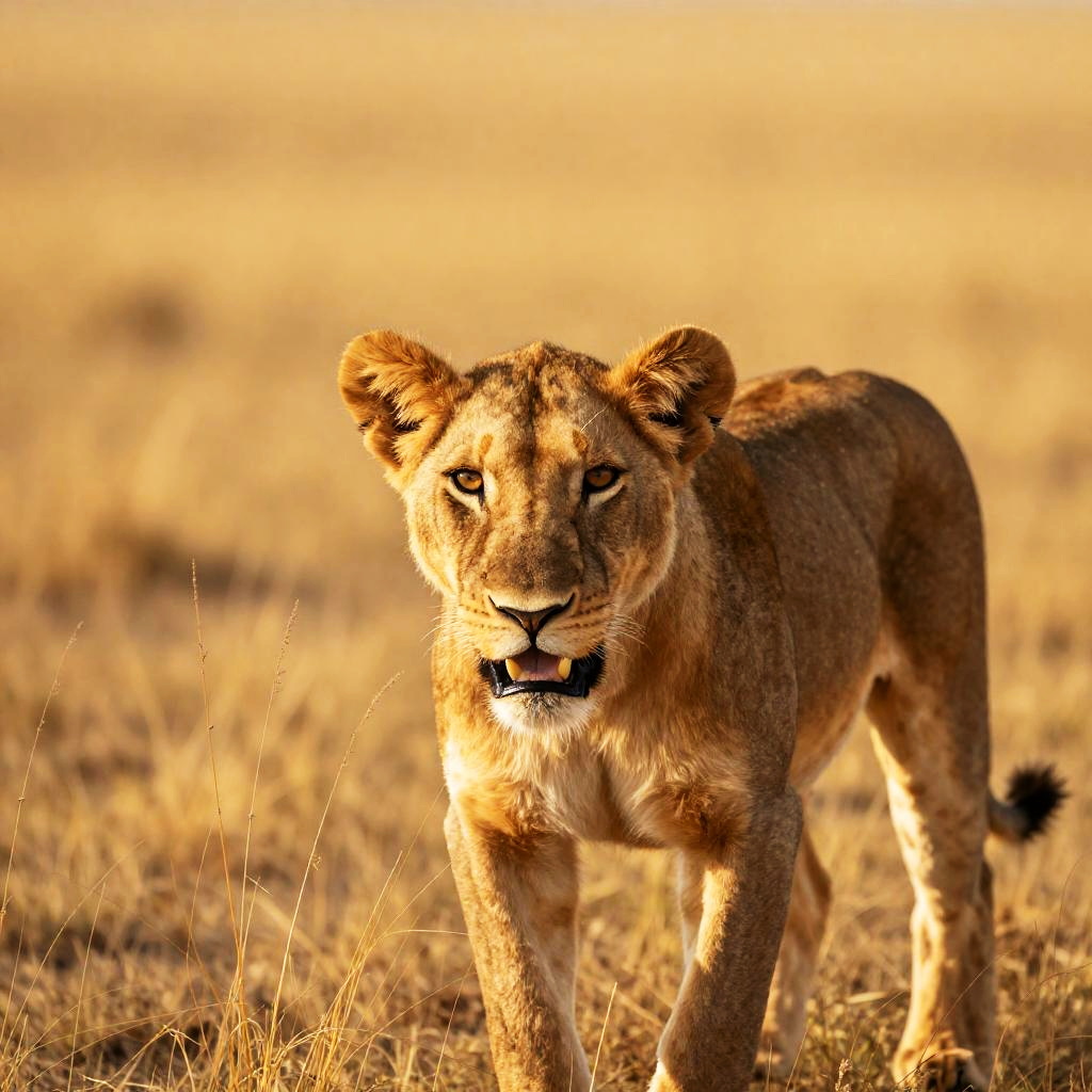 Photograph of a young lion blending into a dry, golden grassy savannah. The lion's face is partially hidden by tall, wispy grass, but its eyes and pink tongue are visible. The background is a blurred expanse of the same grassy field. The lion's fur is a rich, tawny brown, and the sunlight gives the scene a warm, golden hue.