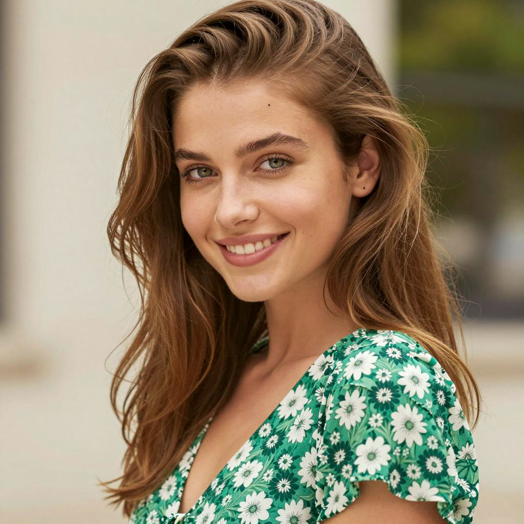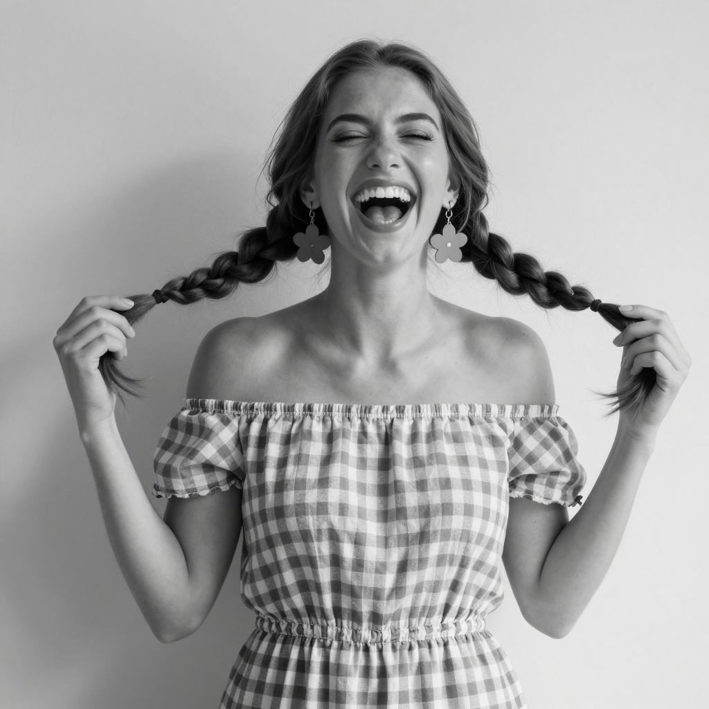 Black-and-white photograph of a woman with long, wavy, tousled hair. She smiles broadly, showing teeth. Wearing an off-shoulder black top, she holds her left hand near her chest, showing a ring. She wears a necklace with a geometric pendant and a bracelet. Background includes blurred building and street. Sunlight highlights her hair and face.