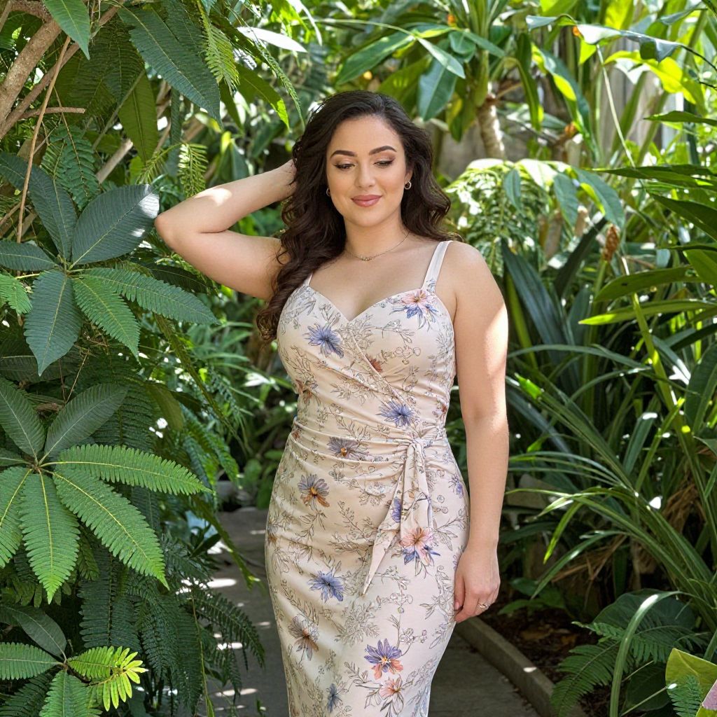 Photograph of a curvy woman with long, wavy black hair, light olive skin, and full lips, wearing a form-fitting, white, floral-patterned dress with thin straps. She stands in a lush, green garden with various tropical plants, including large leaves and ferns, casting dappled sunlight. Her right hand rests on her head, and she gazes downward with a slight smile. The dress features a subtle blue and pink flower design, and she wears small, gold hoop earrings. The background is dense with vibrant green foliage, creating a natural, serene setting.