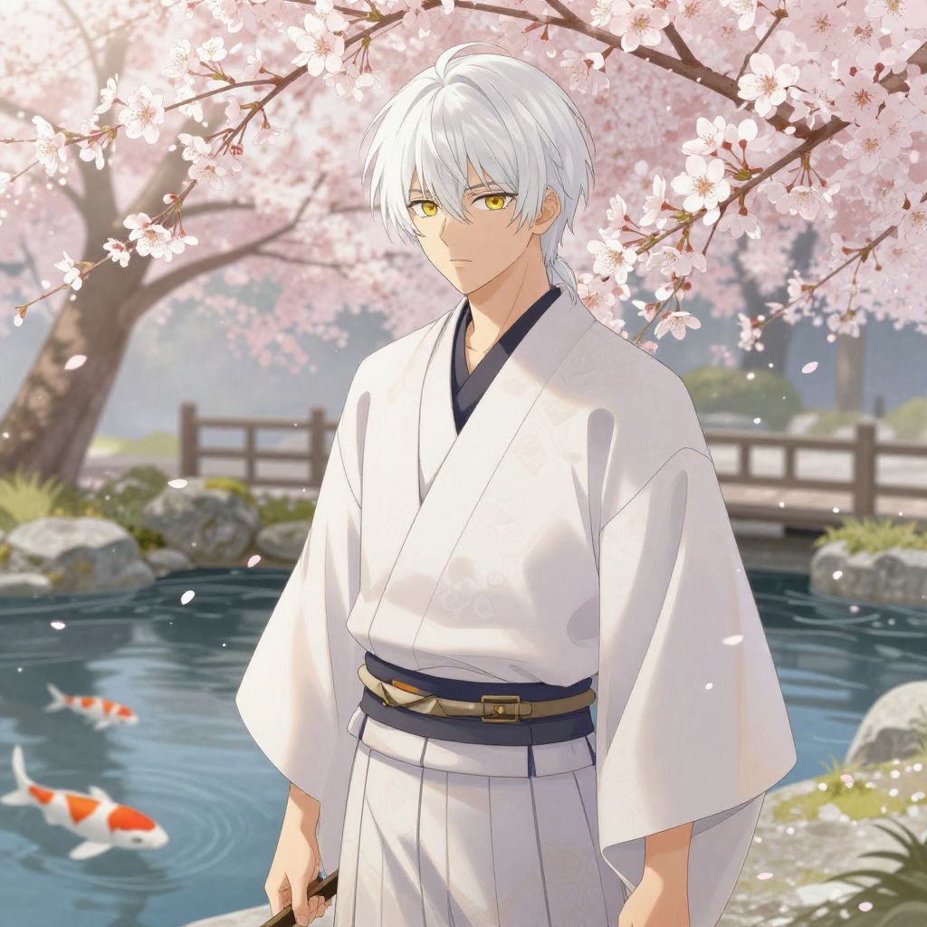 Anime-style drawing of a white-haired, yellow-eyed young man in a white kimono standing by a cherry blossom tree beside a koi pond.