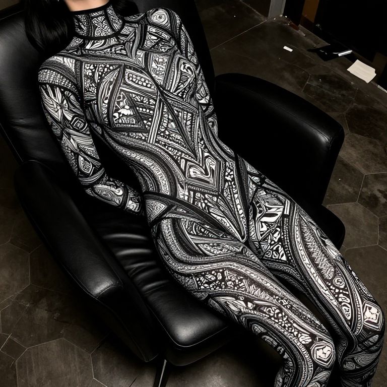 This is a photograph of a person lying on a black leather chair, wearing an intricate, black and white, patterned bodysuit that covers their entire body. The bodysuit features geometric and floral designs. The person's arms are bound behind their back, and their legs are crossed at the ankles. The floor is made of hexagonal tiles, and there's a small, cluttered area in the top right corner. The lighting is dim, creating a moody, almost industrial atmosphere.