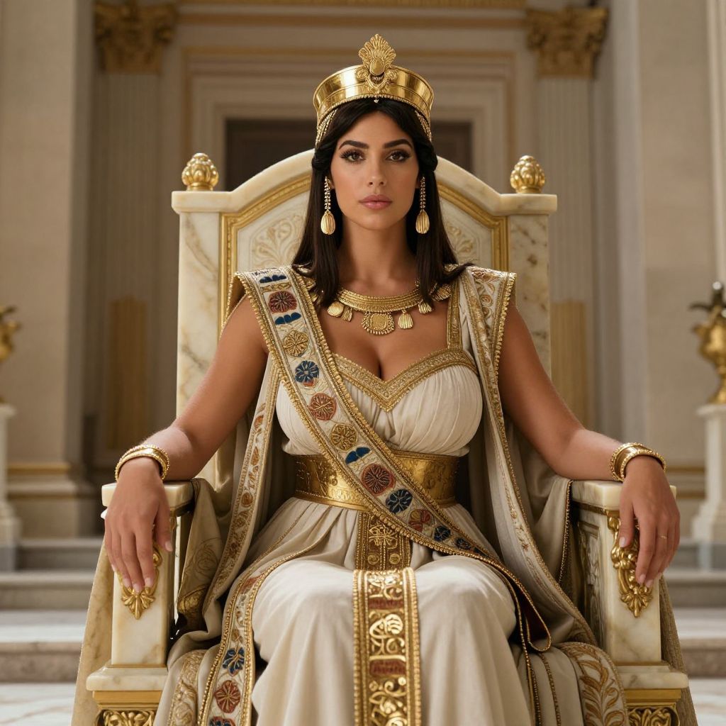 Digital artwork of a regal woman with dark hair, wearing an ornate golden crown, white and gold royal dress, and jewelry, seated on a