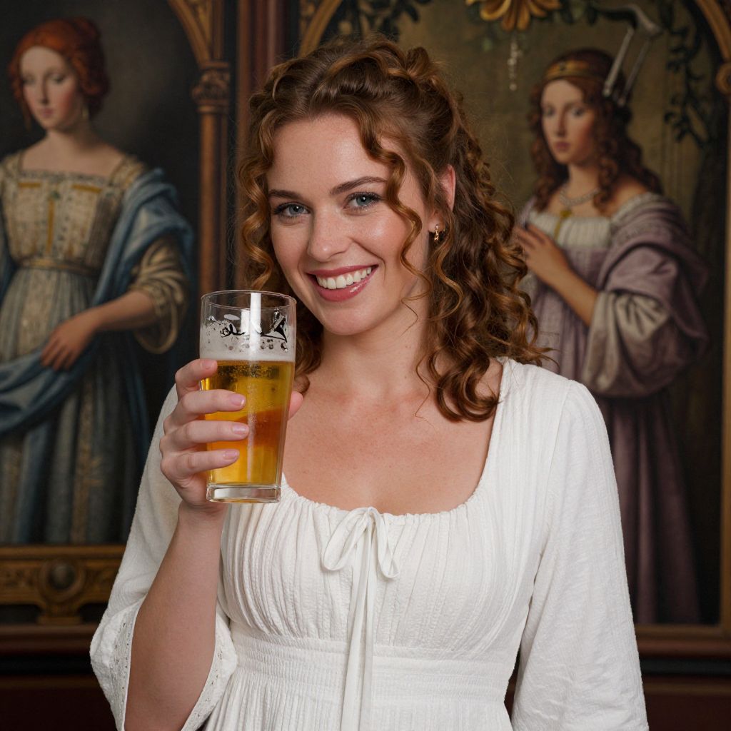 A smiling noble woman in a white dress holds a glass of beer, set against a cinematic, soft-lit background reminiscent of \"Midsummer Eve\" with Pre-Raphaelite influences.