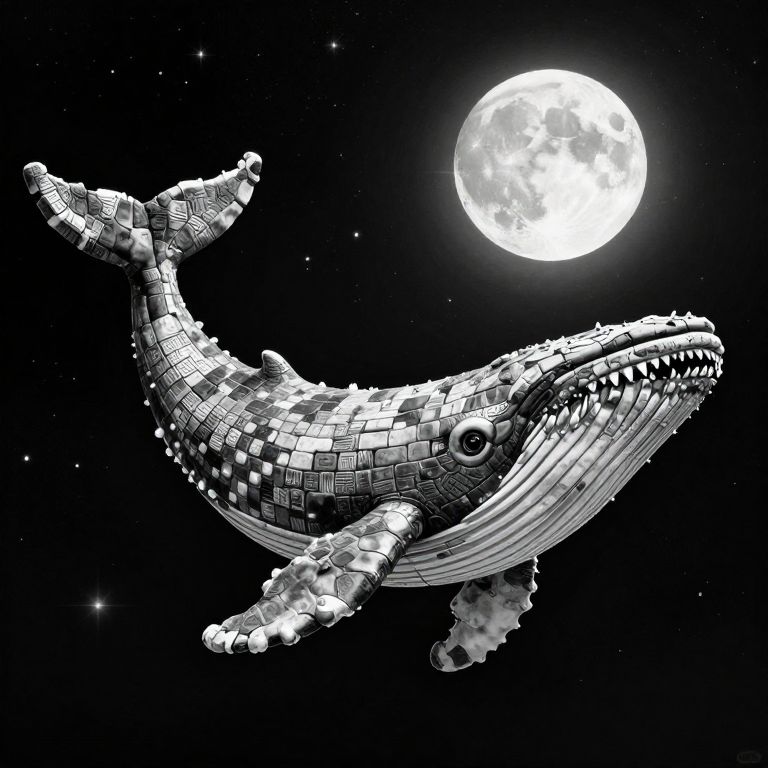 An intricately detailed black-and-white illustration depicts a fantastical whale composed of textured, brick-like segments swimming against a starry night sky, its open mouth revealing sharp teeth as it glides beneath a luminous full moon, creating a surreal and otherworldly visual effect.
