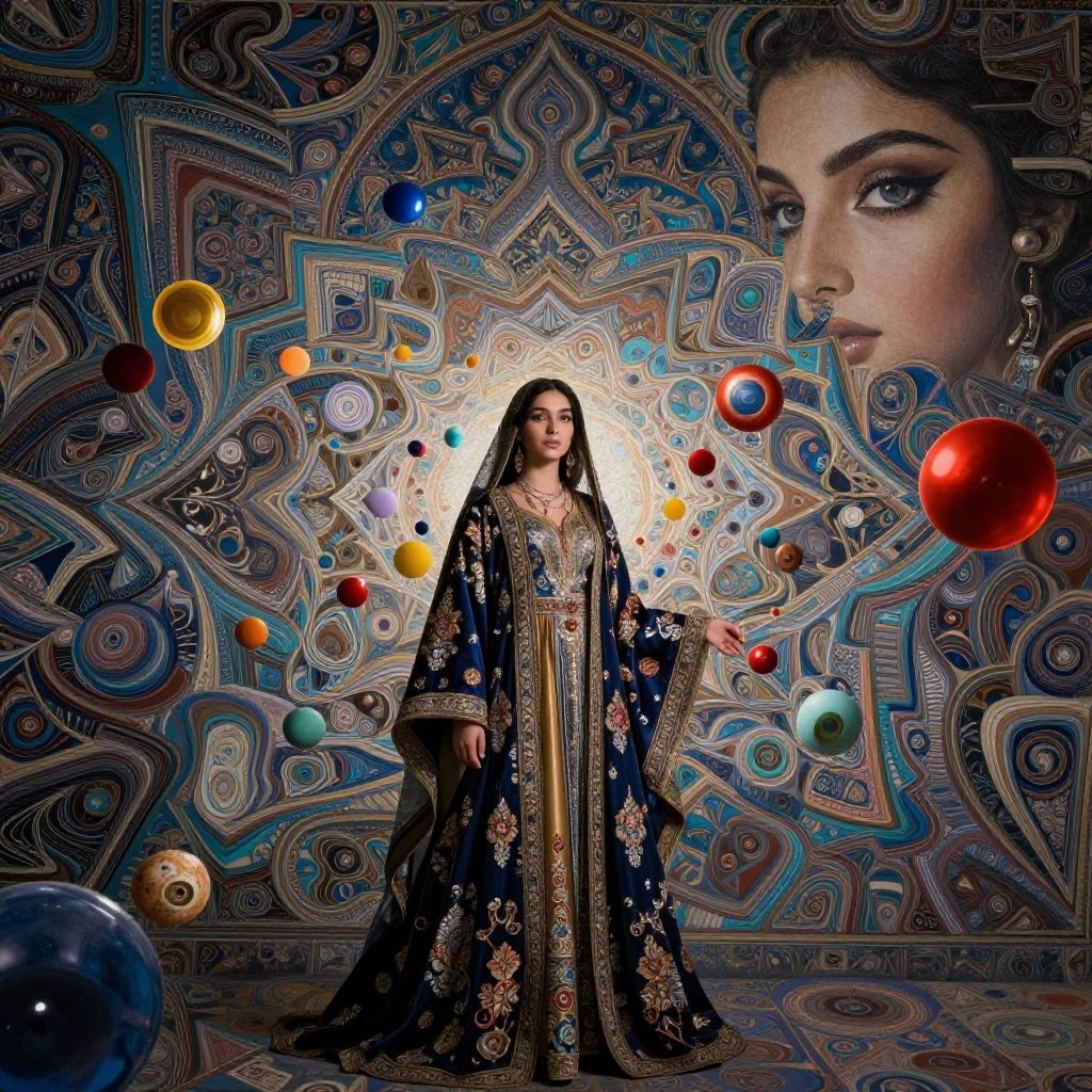 Persian color palette, Persian art, Persian girl, Persian, Iranian, Iran, folk costumes (Carey Hannah Mulligan:1, 2) (8k, RAW photo, highest quality), hyperrealistic, intricate abstract, intricate artwork, abstract style, otherworldly, mesmerizing parallel dimension, gravity defies logic, abstract masterpiece, interplay of floating objects, distorted silhouettes, vivid hues, ethereal light, weightlessness in an unknown realm, non-representational, colors and shapes, expression of feelings, imaginative, highly detailed, extremely high-resolution details, photographic, realism pushed to extreme, fine texture, 4k, ultra-detailed, high quality, high contrasthanfu, clear face, Ultra High Resolution, wallpaper, 8K, Rich texture details, hyper detailed, detailed eyes, detailed background, dramatic angle, epic composition, SimplepositiveXLv1 (masterpiece), model photoshoot, a stylish girl, by (David LaChappelle:1.3)