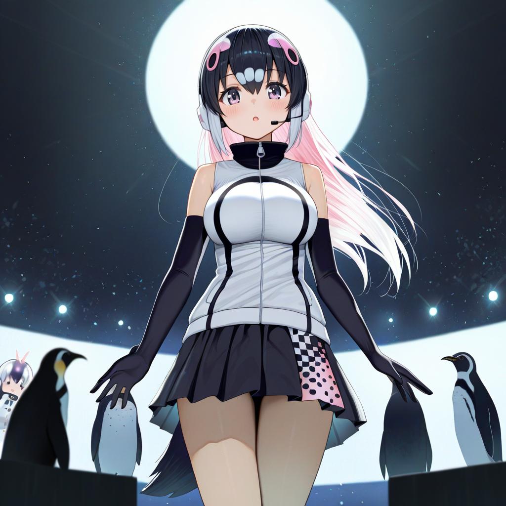 African penguin (kemono friends), kemono friends, 1girl, tail, black eyes, black hair, long hair, multicolored hair, white hair, pink hair, skirt, headphones, virtual youtuber, virtual youtuber, penguin girl, microphone, by artist yt (wai-tei), leet
