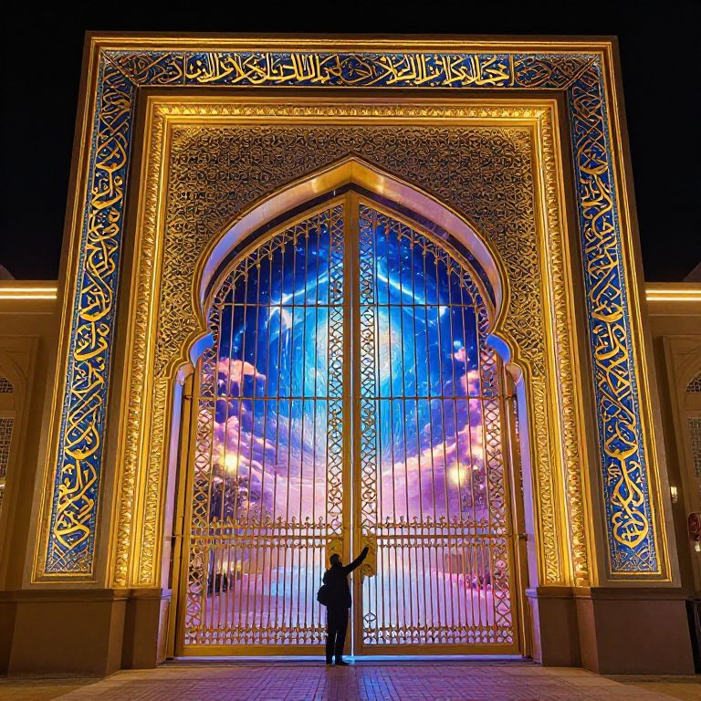 Lcd Screen big gate mystic with arabic and royal style with golden and blue, a little person start to enter, inside the gate a wonderfull world of dreams,